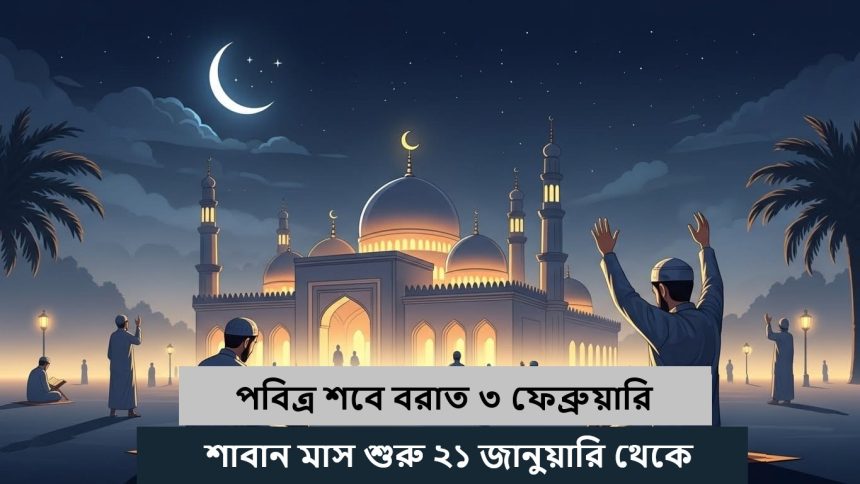 পবিত্র ও ফজিলতপূর্ণ রাত শবে বরাত আগামী ৩ ফেব্রুয়ারি পালিত হবে। আজ ২০ জানুয়ারি বাংলাদেশের আকাশে পবিত্র শাবান মাসের চাঁদ দেখা যাওয়ার সম্ভাবনা রয়েছে। চাঁদ দেখা সাপেক্ষে আগামীকাল ২১ জানুয়ারি থেকে পবিত্র শাবান মাসের গণনা শুরু হবে বলে সংশ্লিষ্ট ধর্মীয় সূত্রগুলো জানিয়েছে।