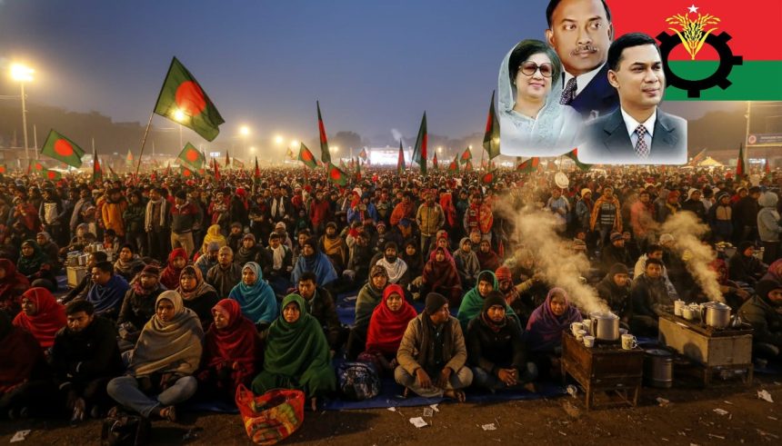 সরেজমিনে দেখা গেছে, মাঠে ইতিমধ্যে কয়েক হাজার মানুষ অবস্থান নিয়েছেন। রাত বাড়ার সঙ্গে সঙ্গে মানুষের সংখ্যাও বাড়ছে। শীত উপেক্ষা করে শামিয়ানার নিচে ত্রিপল বিছিয়ে বসে আছেন দূরদূরান্ত থেকে আসা নেতা-কর্মী ও সমর্থকেরা। কেউ কেউ চাদর মুড়ি দিয়ে ঘুমাচ্ছেন, আবার অনেকে স্লোগানে স্লোগানে মাঠ মুখর করে তুলছেন।